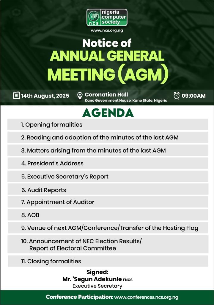 The Nigeria Computer Society (NCS) National Executive Council (NEC) 2025 General Elections will hold as stated in the Electoral Timetable. Attached are: